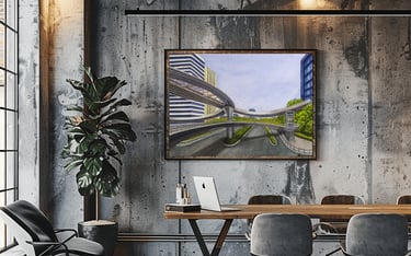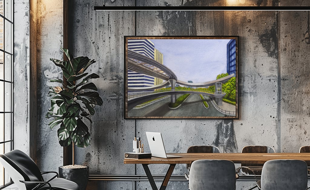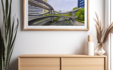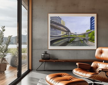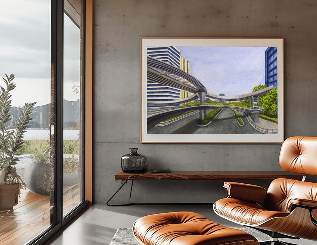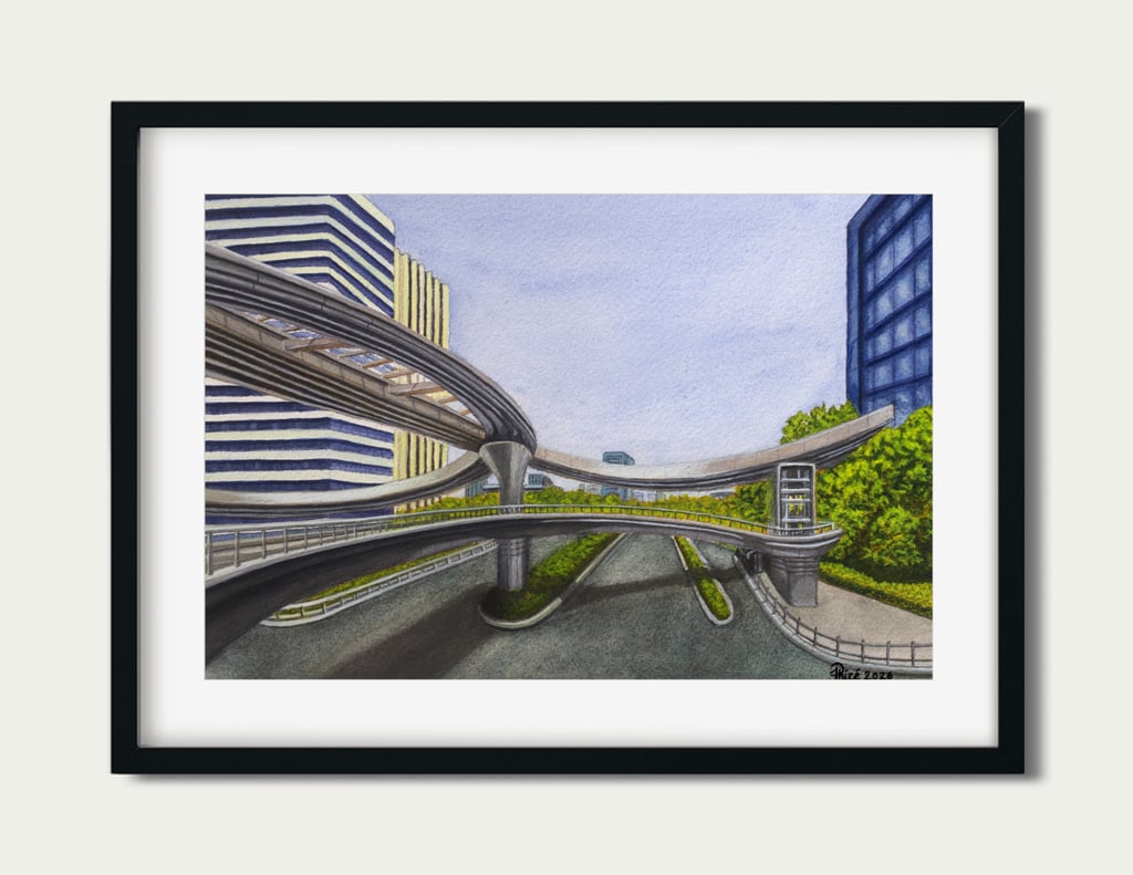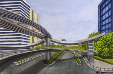 Original painting on archival materials, inspired by the Binkang Road and Jucai Road pedestrian bridge in Hangzhou.