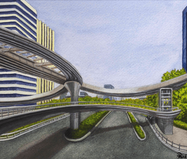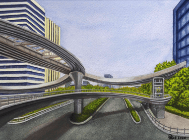 A painted record of the built frameworks of our time, stylised to convey focus and stillness.